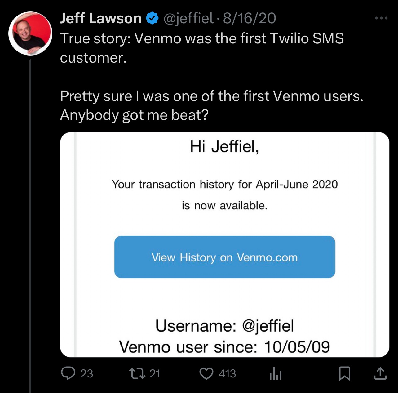 Jeff Lawson as first Venmo user