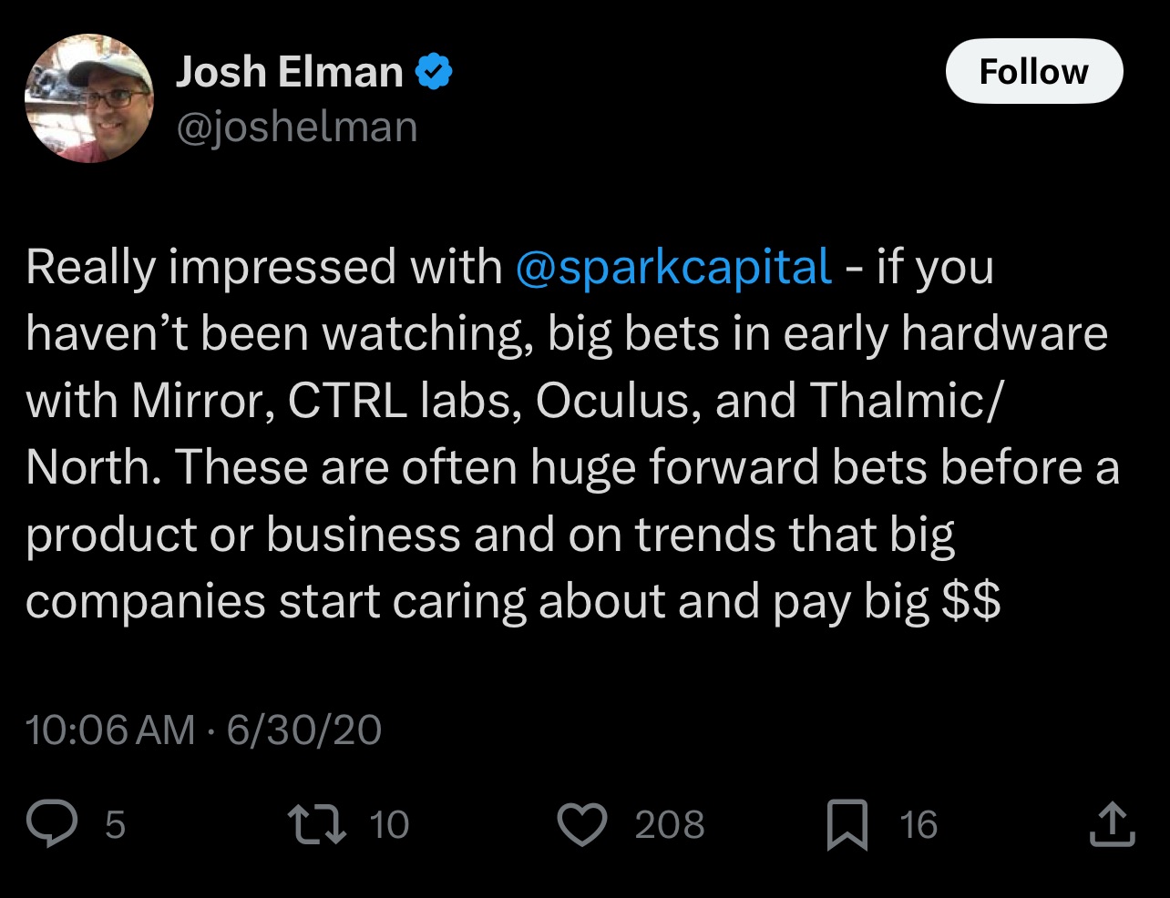 – if you haven’t been watching, big bets in early hardware with Mirror, CTRL labs, Oculus, and Thalmic/North. These are often huge forward bets before a product or business and on trends that big companies start caring about and pay big $$